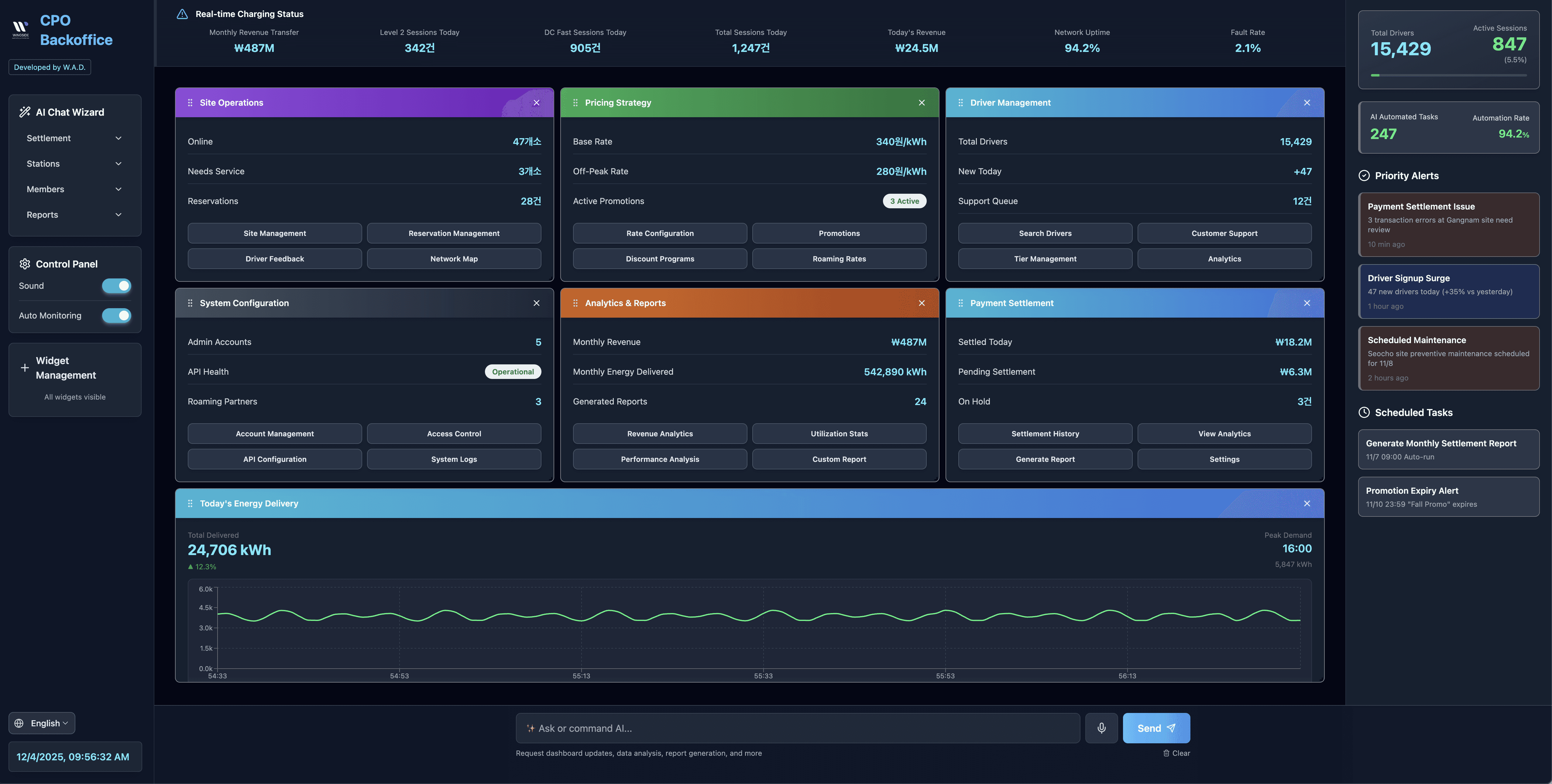완전 자동 운영 시스템 24시간 무인 모니터링, 예측 정비, 에너지 최적화까지. 충전소가 스스로 돌아갑니다.